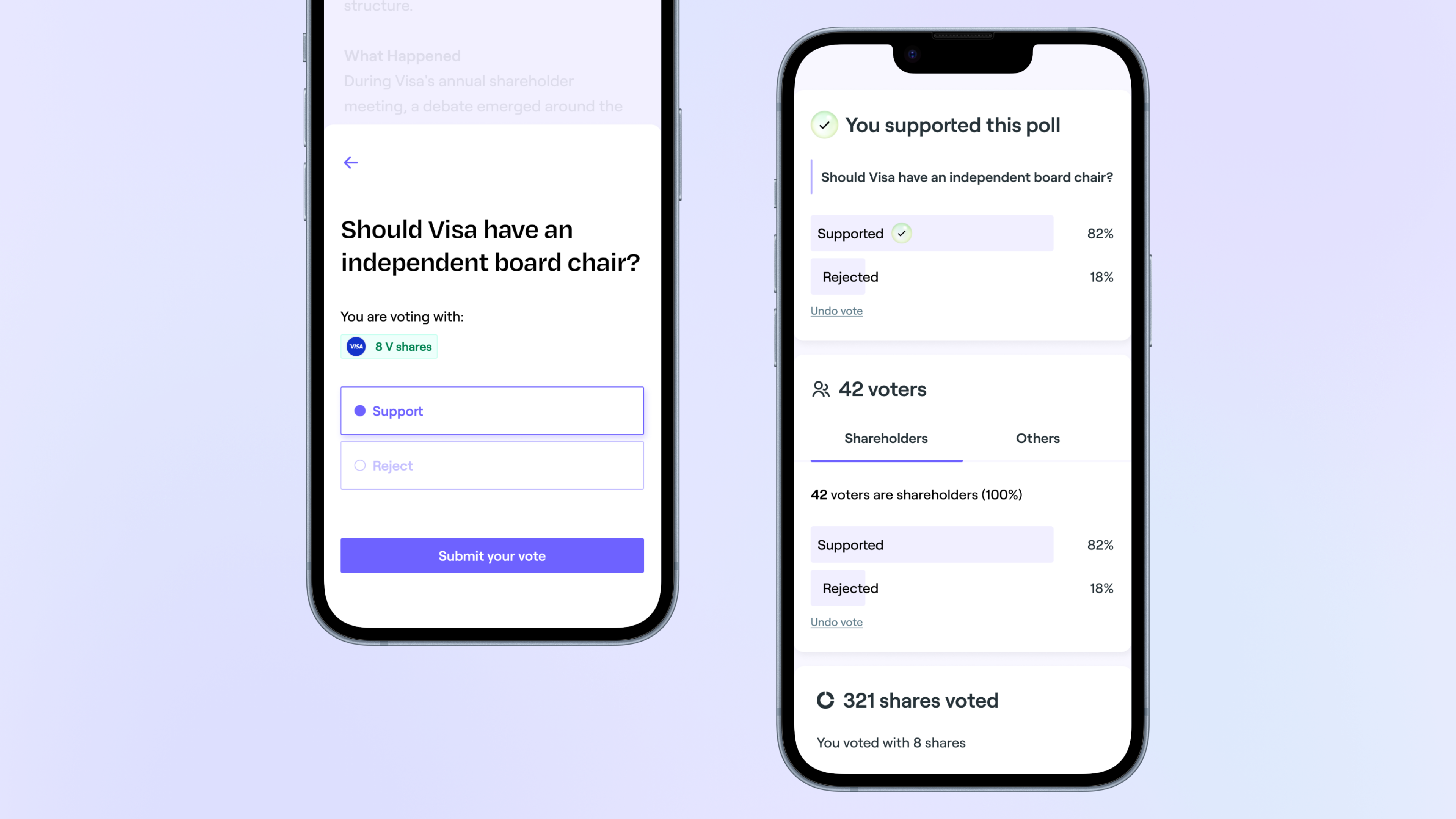 We emphasized ownership within the poll voting experience as well. A green shareholder badge displayed the company logo, name, and number of shares owned, making each user’s personal stake clear.